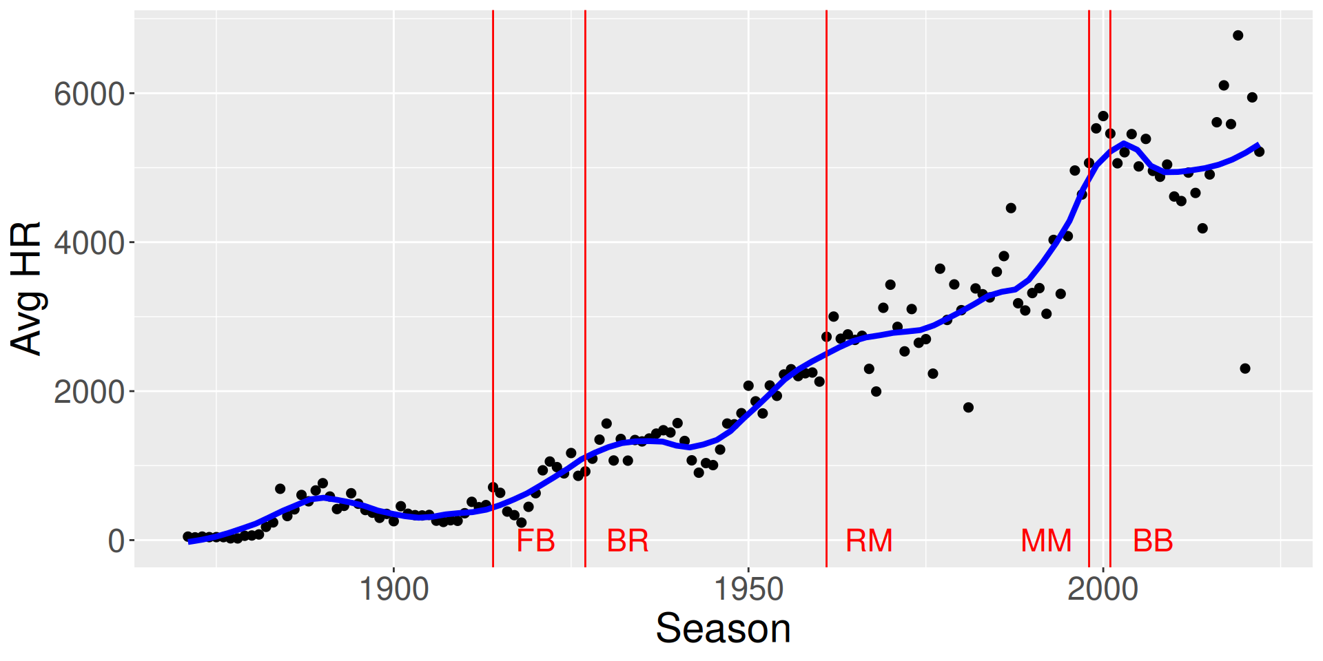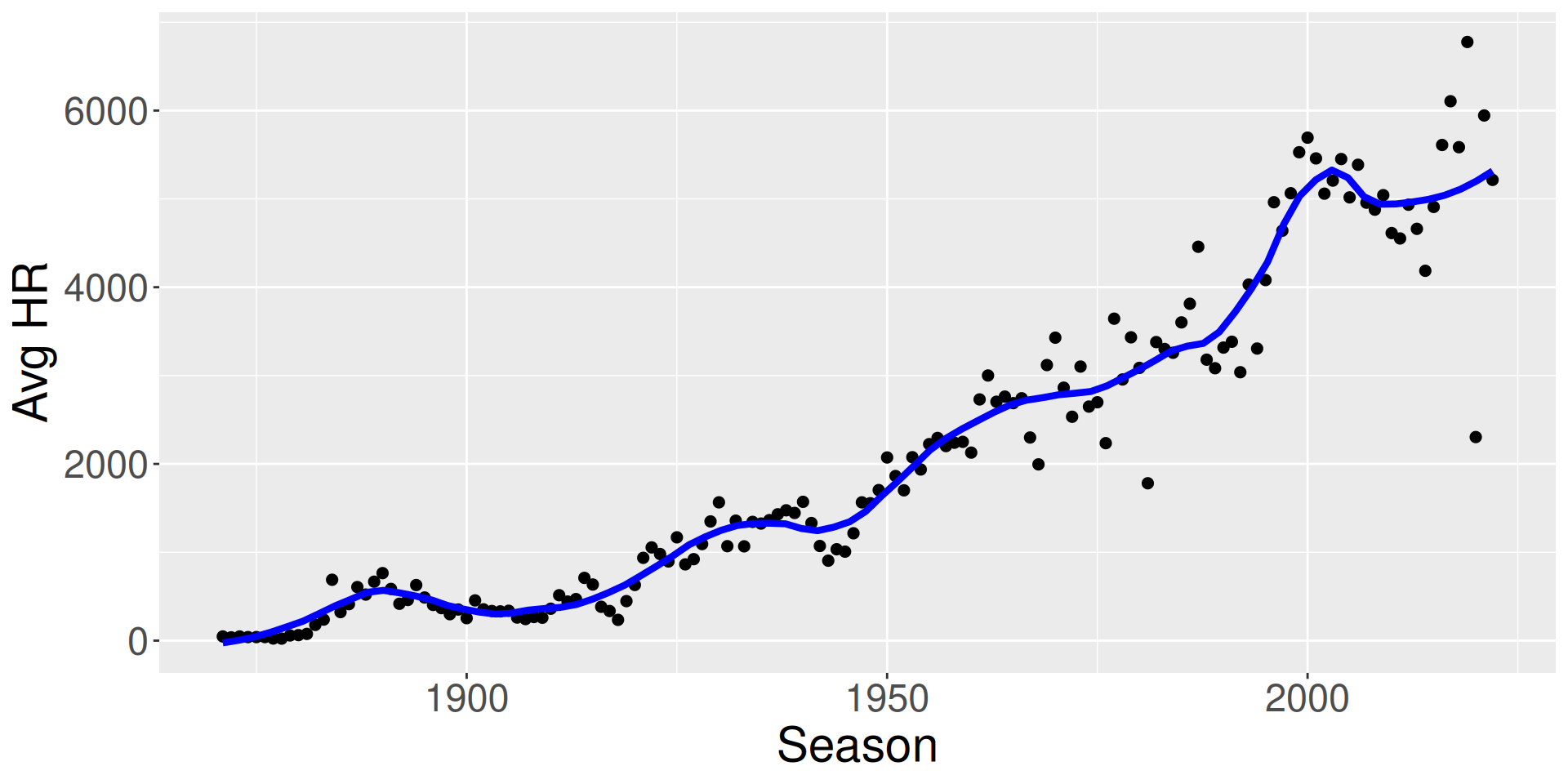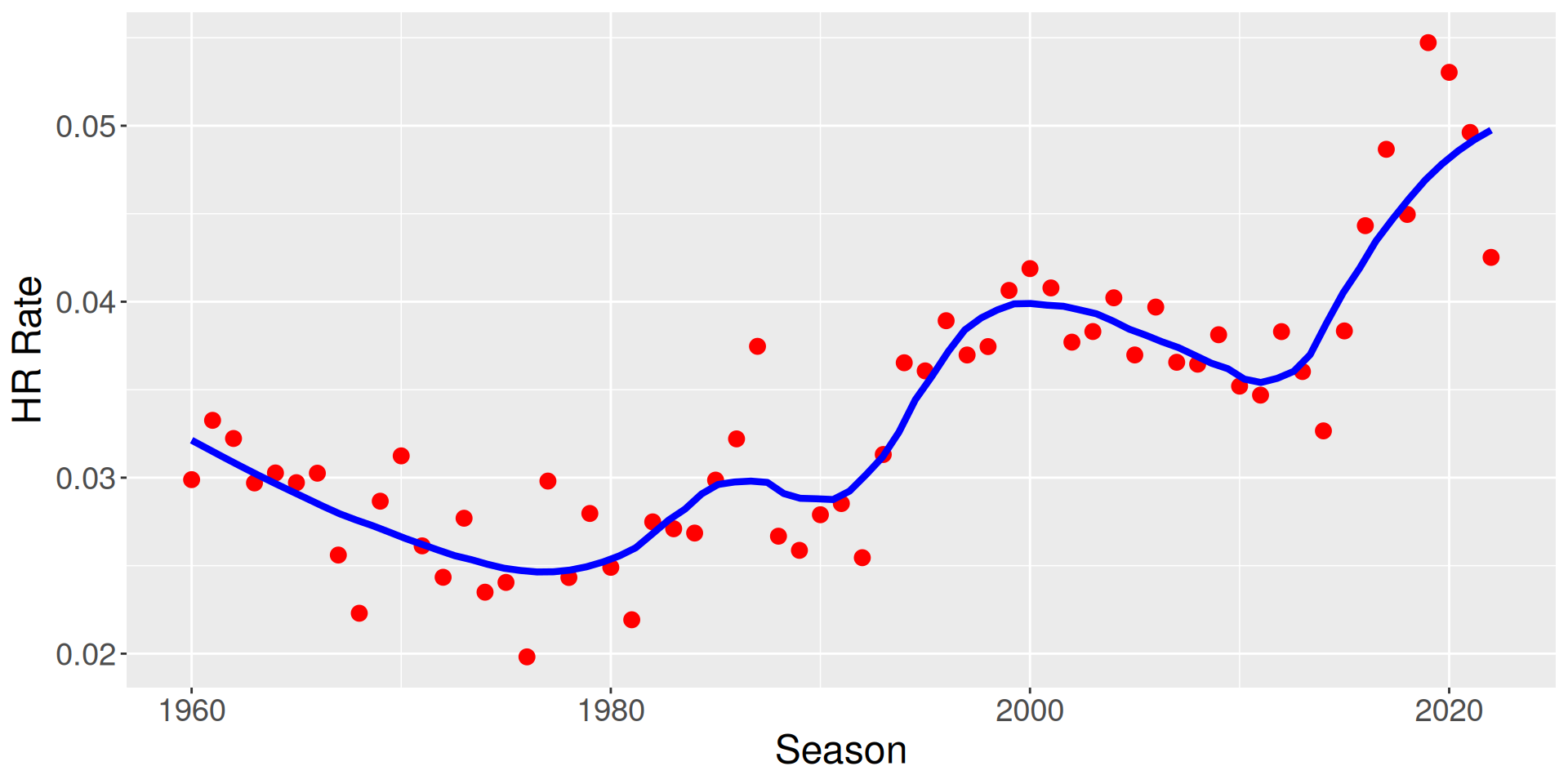 Define the home run rate as the fraction of \(HR\) among all batted balls (\(AB - SO\)) \[ HR \, Rate = \frac{HR}{AB - SO} \]
