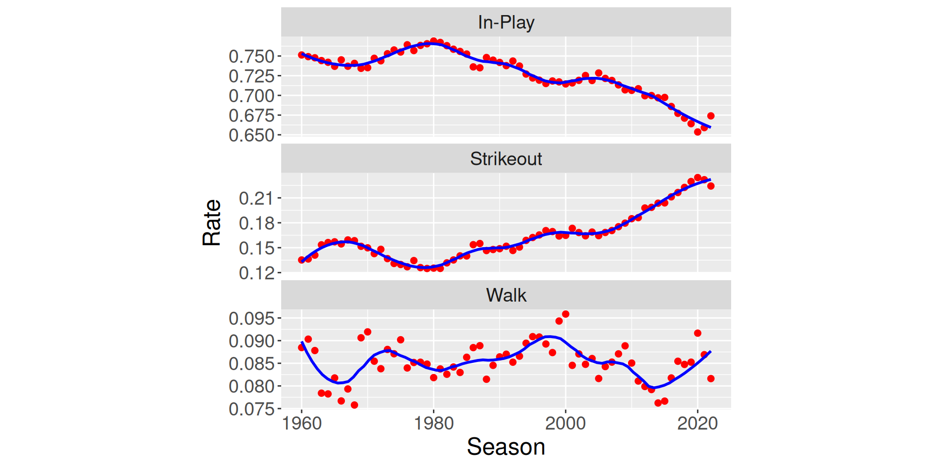 How have the rates of these three outcomes changed over the last 50 years of baseball?