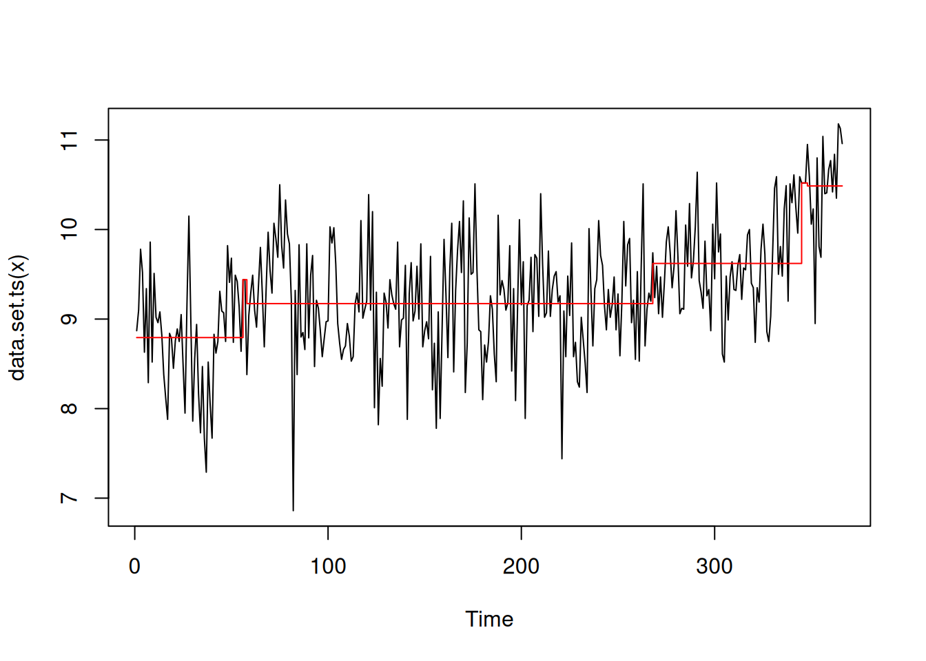 We compare the results visually using plot() (see Figure 2), which now always situates the model estimates in the domain of the original time series. Each panel of Figure 2 shows the original time series (black line) segmented by the changepoints determined by the various algorithms (vertical dotted lines). The horizontal red lines indicate the mean and 1.96 times the standard deviation within each region, as per the summary produced by tidy() (see Section 3.2).
