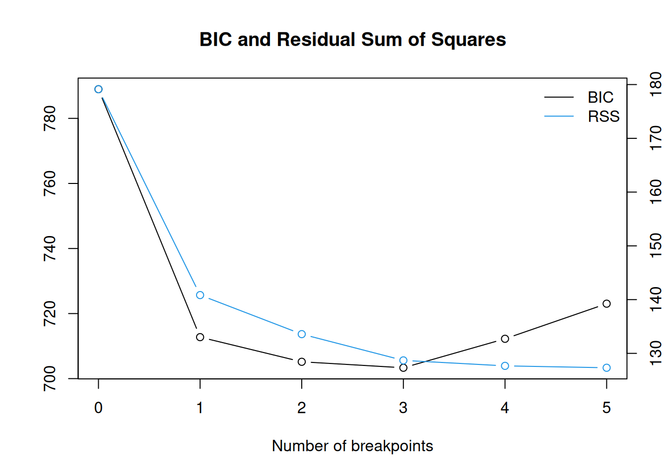 Bai and Perron (1998) use linear regression models fit by least squares to detect changepoints. In particular, they construct a framework for testing the alternative hypothesis that there is one additional changepoint. Zeileis et al. (2003) build on this and related work by Bai and Perron (2003), using a series of F-statistics and a dynamic programming algorithm to find the set of changepoints that minimize the residual sum of squared errors (see Section 1.6). V. M. Muggeo (2003) also employs a linear regression framework, but iteratively fit models using the Davies test (Davies 1987) as a criterion.