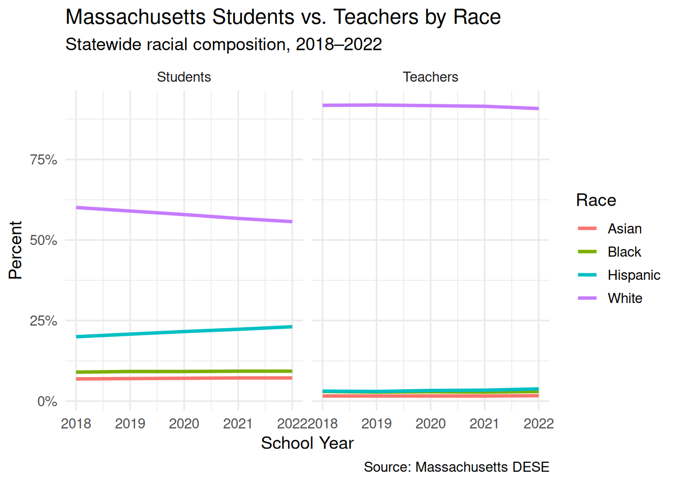 Massachusetts classrooms are getting more diverse, but teachers are not. In the analysis done on data from 2018 to 2022, teachers are consistently more than 90% white, while Massachusetts students are 60% white, or less, and steadily decreasing.