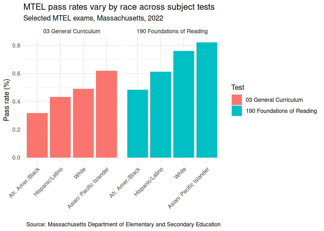 Looking at the Massachusetts Department of Elementary and Secondary Education data reveals some persistent disparities among several MTEL exams. Black and Hispanic test takers pass at significantly lower rates than their white counterparts. These gaps appear in the elementary licensure exams and remain consistent when averaged across other MTEL exams.
